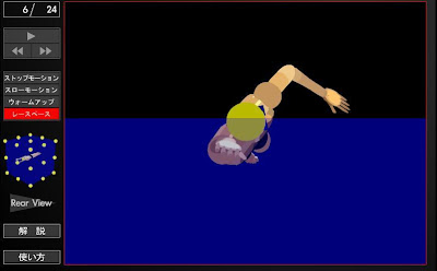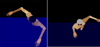 הדמיית תלת מימד של שחיינים שונים מזוויות 'צילום' שונות ולפי בחירה. את כל הרצף ניתן למצוא כאן (אפשר לבחור 'מצלמות' שונות ומהירות שונה).